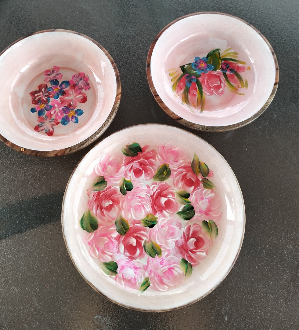 Beautiful hand painted pink roses. This is a 3 piece set 16cm in diameter. 4cm deep. Resin finish on the inside so water and moisture resistant . Made here on the Gold Coast a real talking point, one off not massed produced
