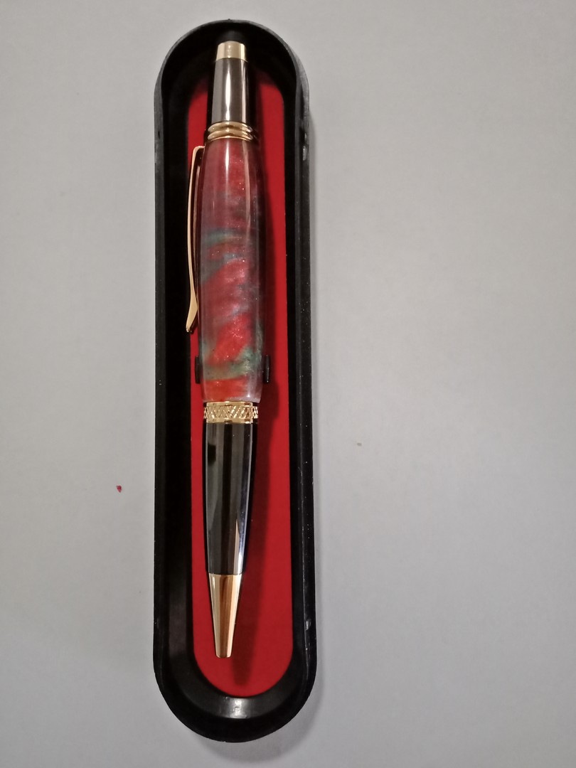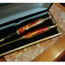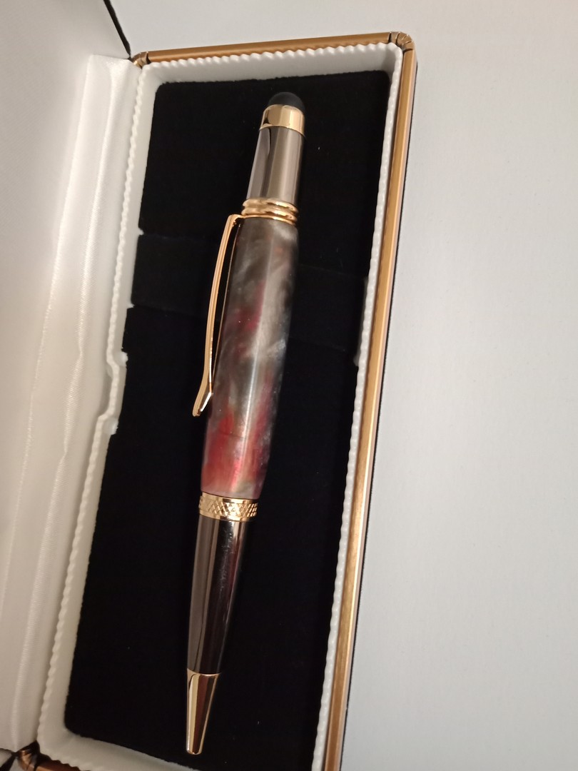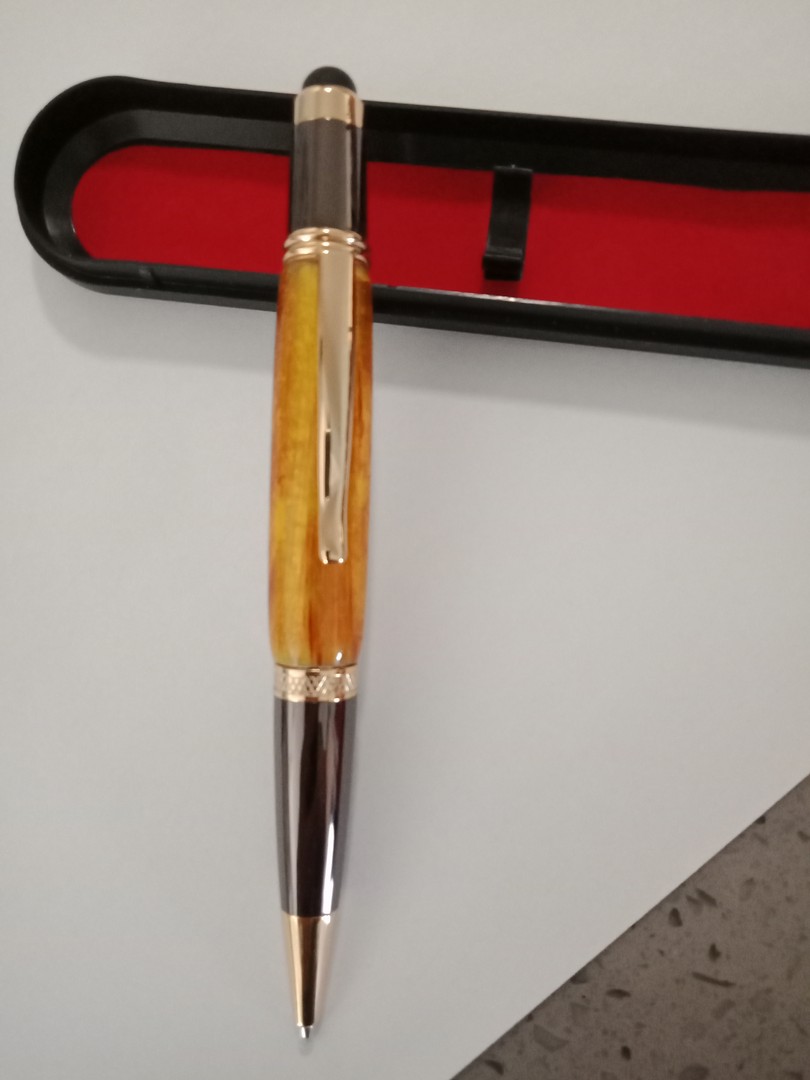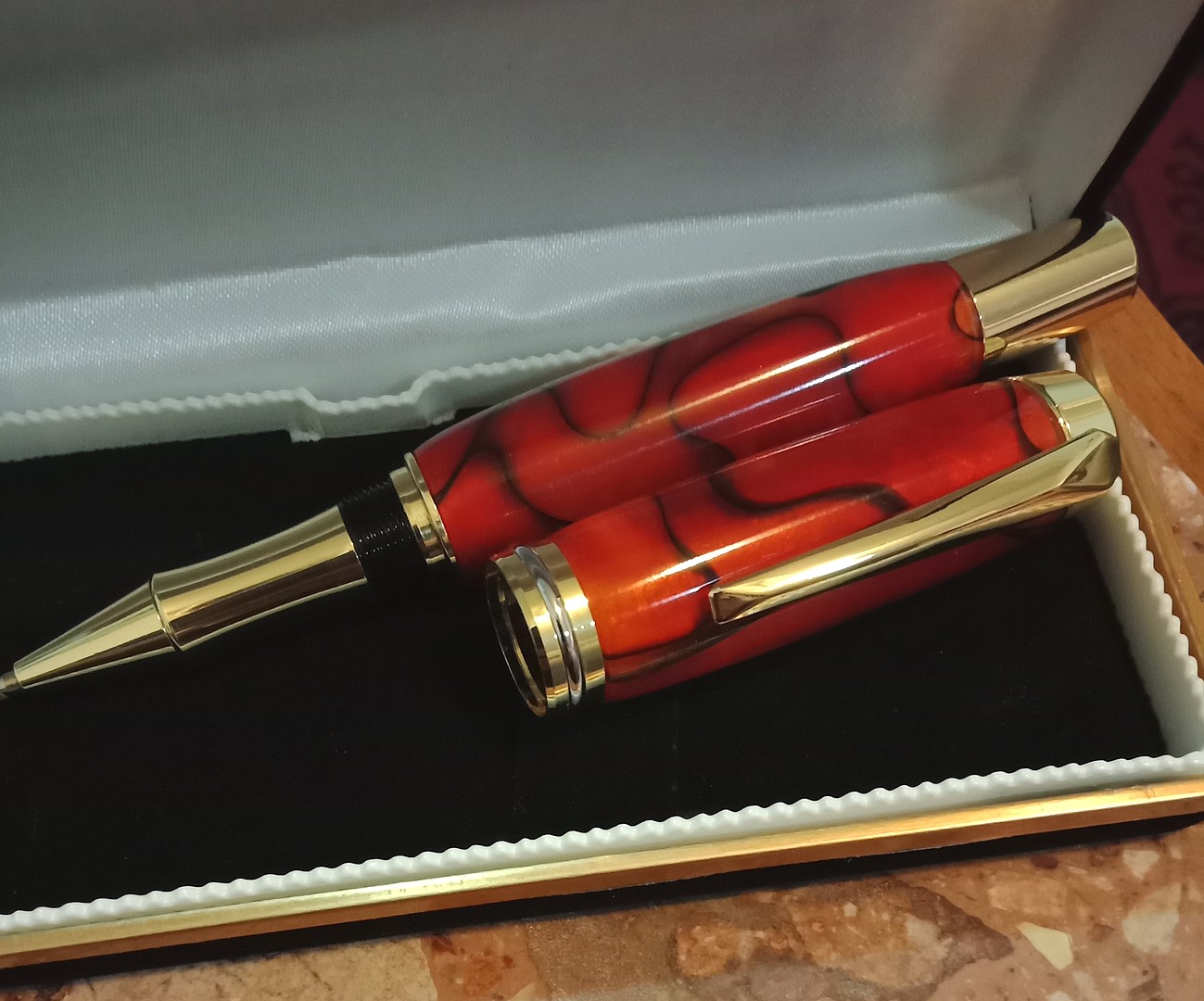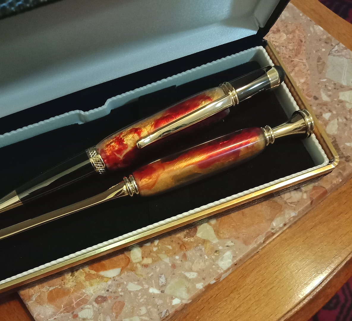Pen and letter opener. Both 22kt gold plated, pen has rubber stylus for cell phone use . Transparent red and golden yellow resin. Yes some more bucket chemistry . Looks great . Supplied in black faux leather case