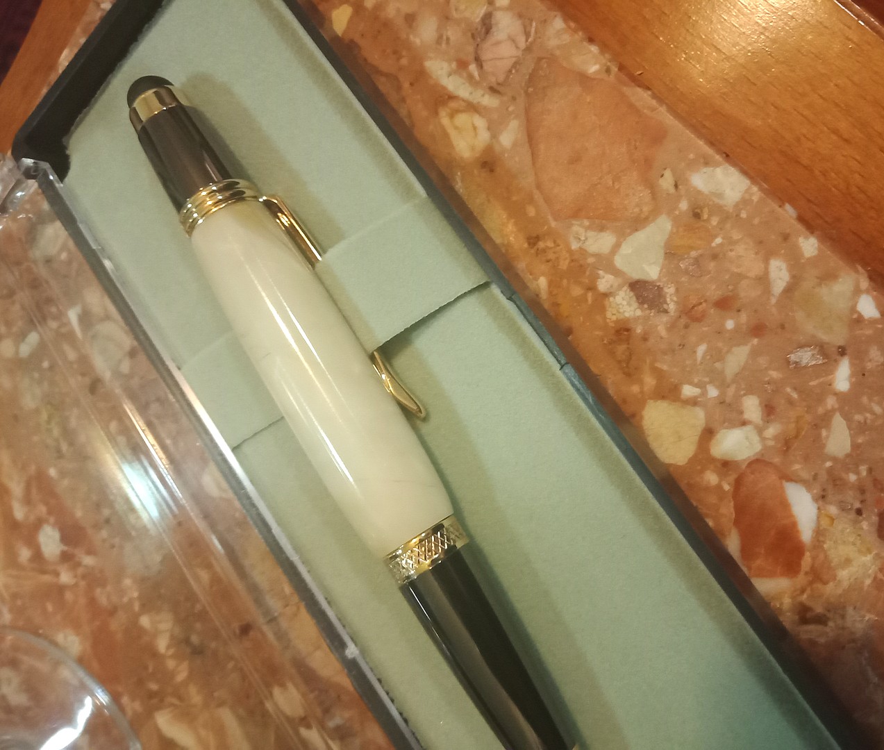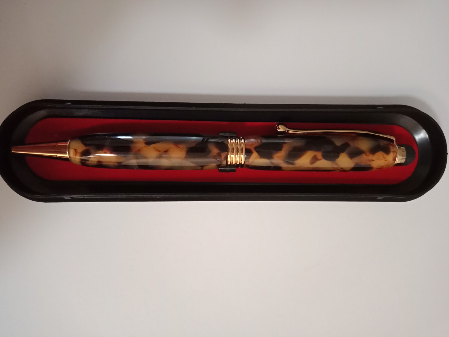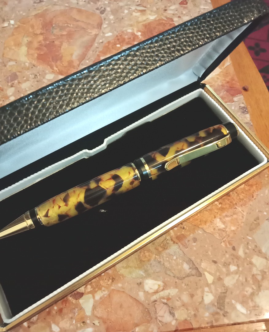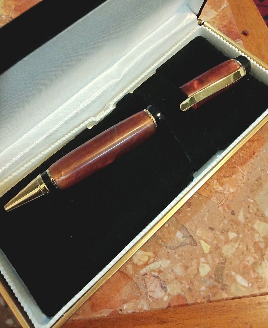 Pen and letter opener. Both 22kt gold plated, pen has rubber stylus for cell phone use . Transparent red and golden yellow resin. Yes some more bucket chemistry . Looks great . Supplied in black faux leather case