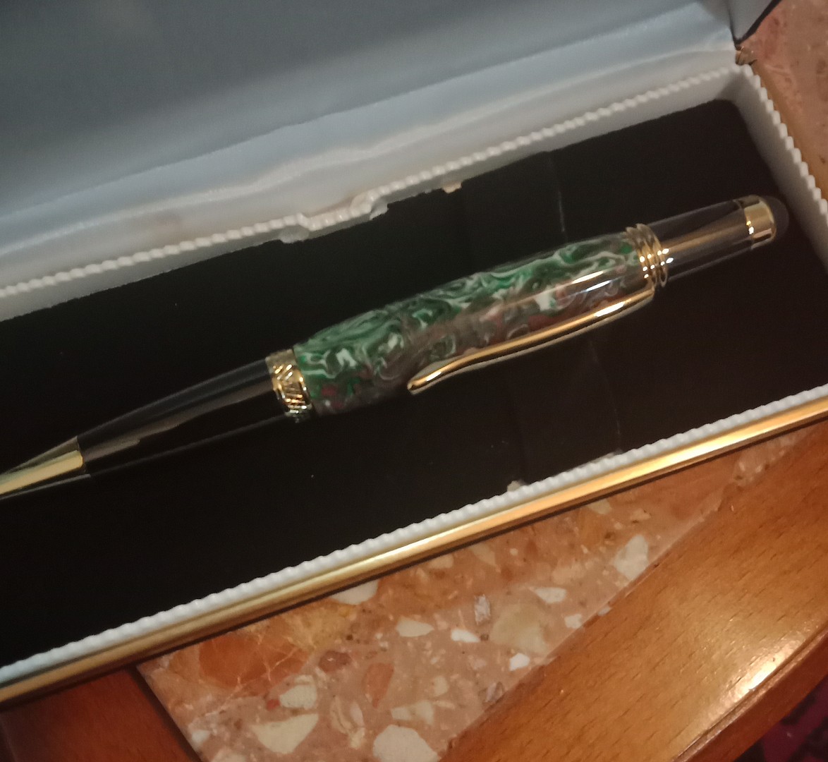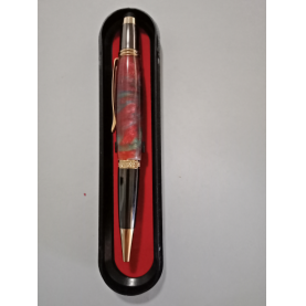Veragated Hodgepodge of greens and browns. Not even too sure myself how I did it. However it is quite effective . 24kt Gold plating , large ink reserve, hand made with high gloss finish. Rubber end stylus for bashing cell phone. Supplied in white silk , black velvet case.