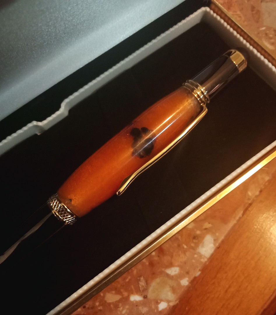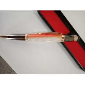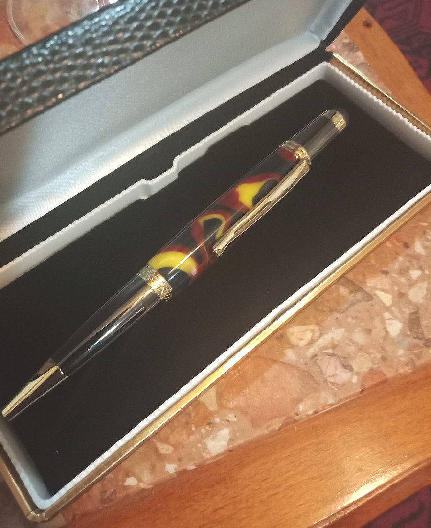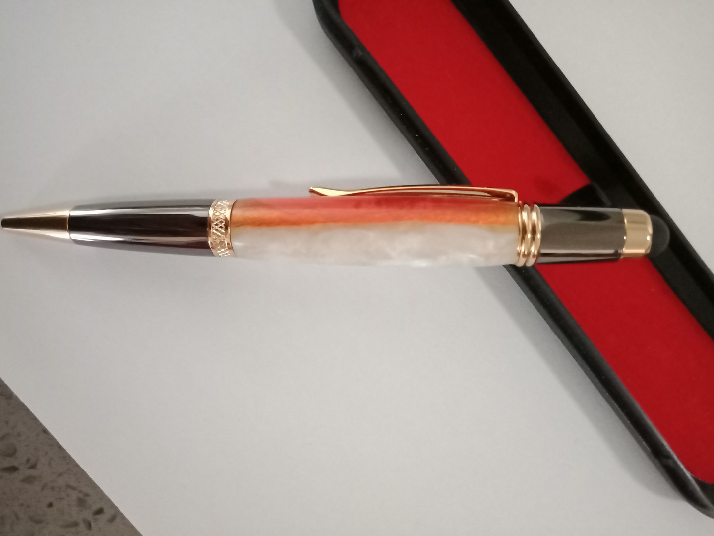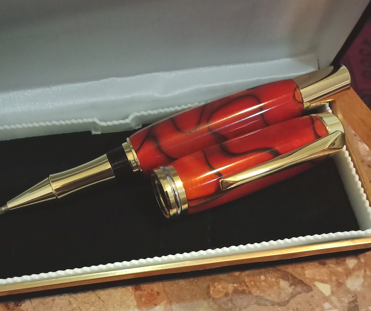 Orange red fire trapped in a pen. real bucket chemistry. 24kt Gold plating , large ink reserve, hand made with high gloss finish. Smooth action ( as with all my pens ) Rubber end stylus for bashing cell phone. Supplied in faux black leather case.