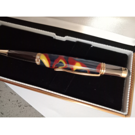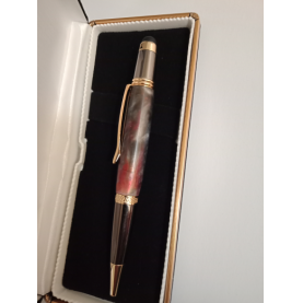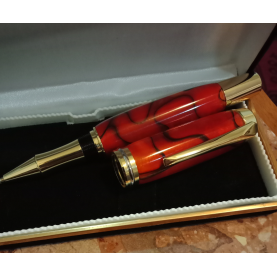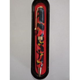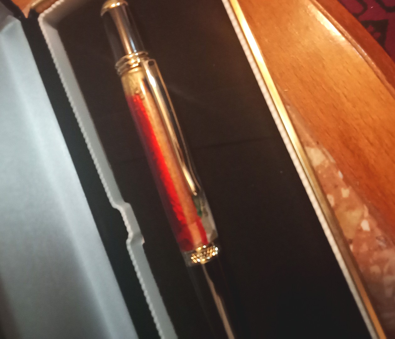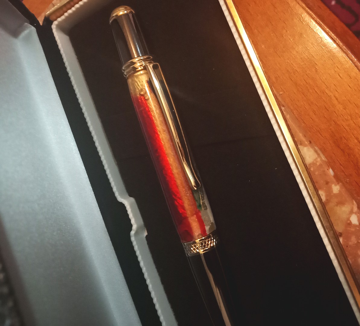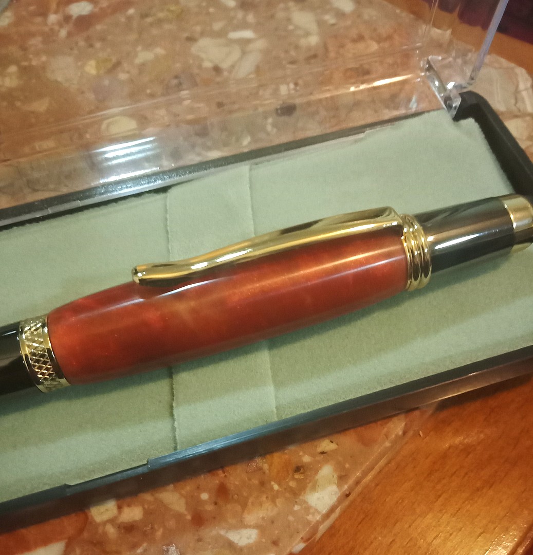 Orange red fire trapped in a pen. real bucket chemistry. 24kt Gold plating , large ink reserve, hand made with high gloss finish. Smooth action ( as with all my pens ) Rubber end stylus for bashing cell phone. Supplied in faux black leather case.