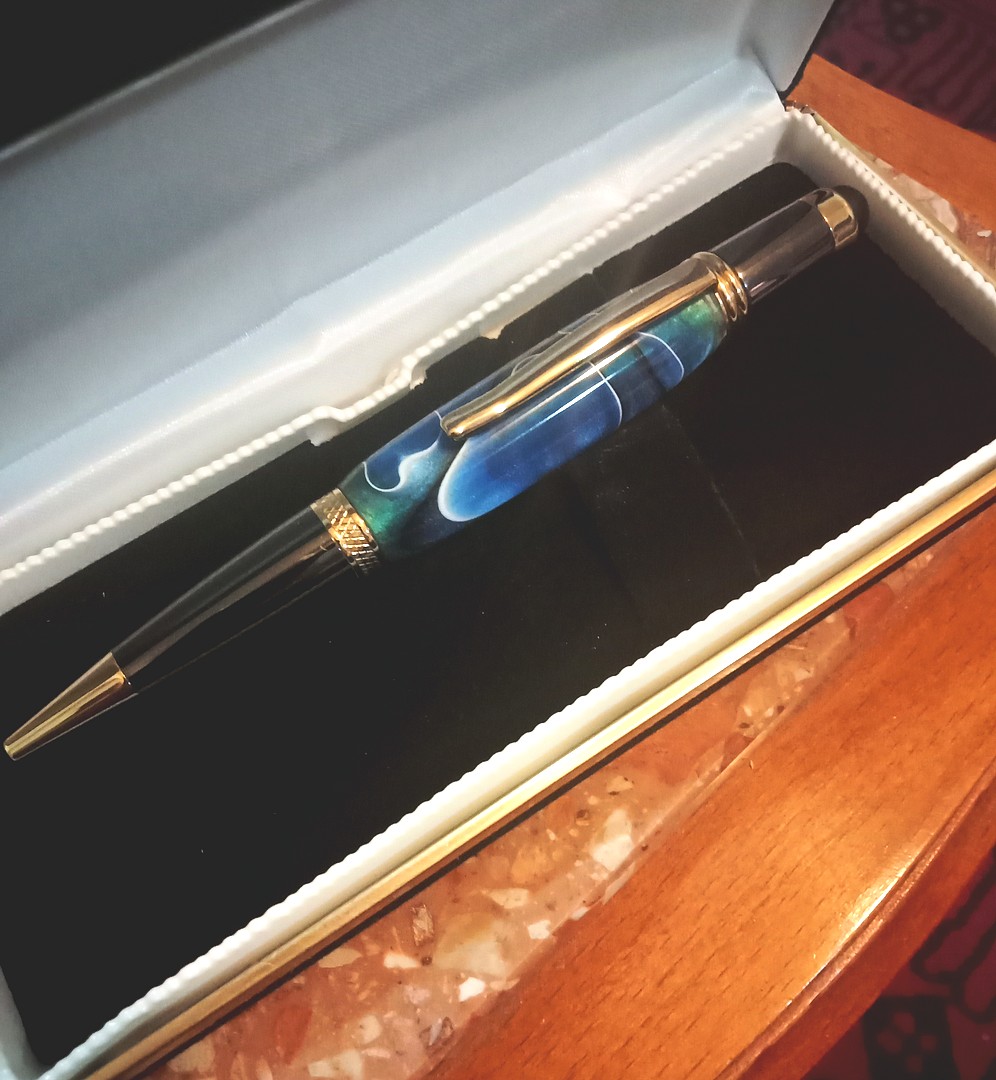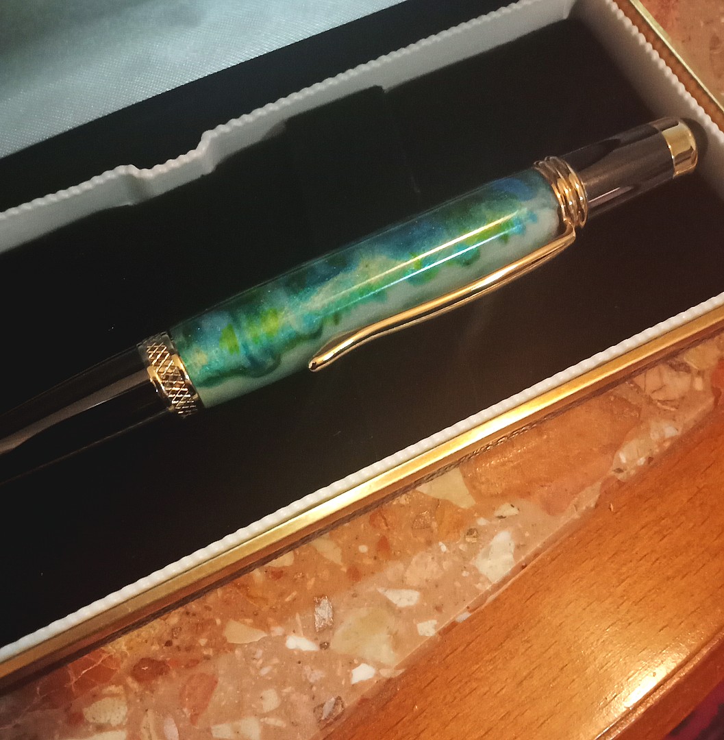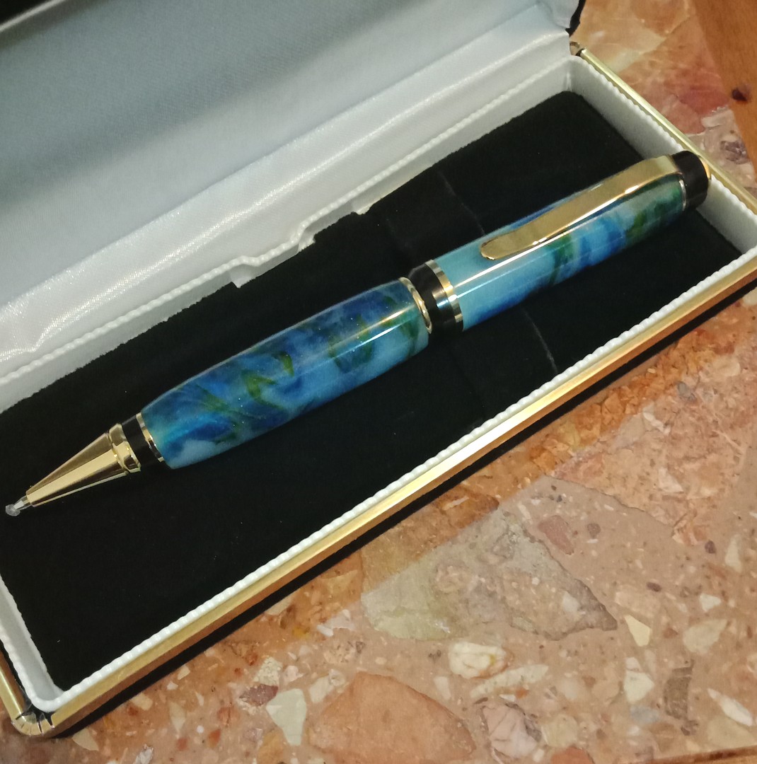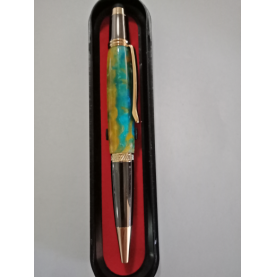A blue / green pale sky blue resin. This pen is really has nice colour combination. 24kt Gold plating , large ink reserve, hand made with high gloss finish. Rubber end stylus for bashing cell phone. Supplied in white silk , black faux leather case.