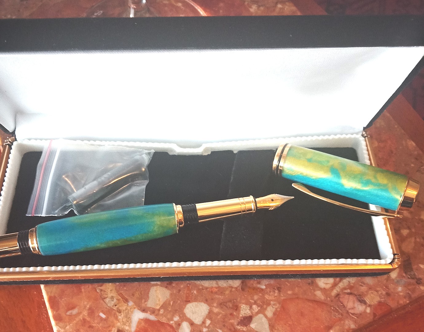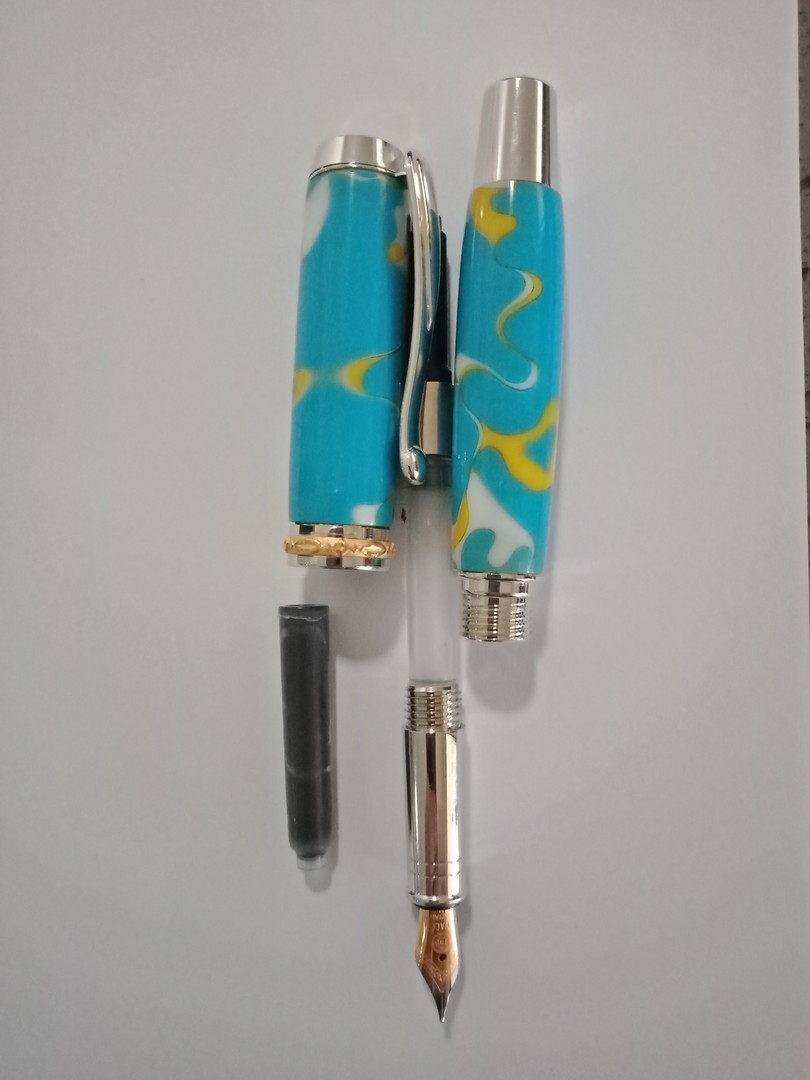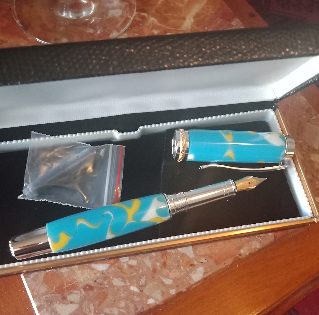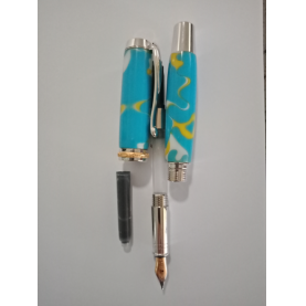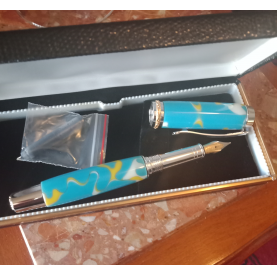 Blue and golden yellow body resin. Colour and casting hand made , metal parts 22kt gold plating. ( will never tarnish ) nib "M". Supplied with pen pump converter ( not shown )+ fountain pen cartridge in white silk / black velvet case. Very nice finish. You will not see two of them