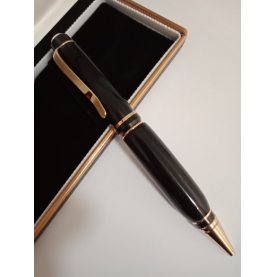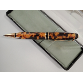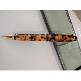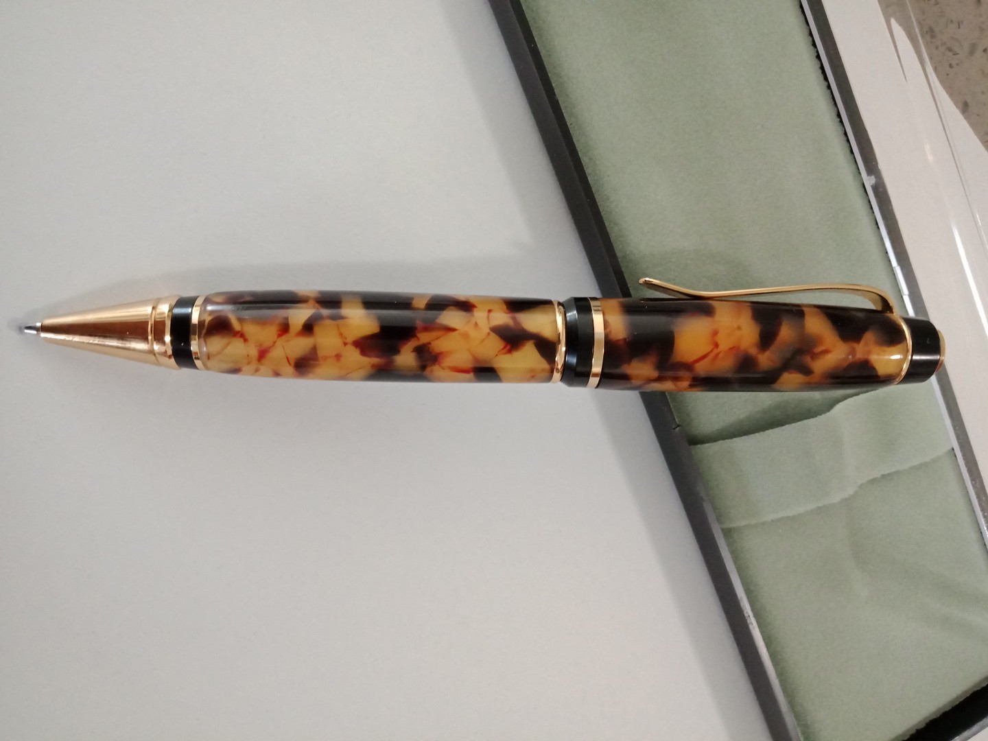 A big elegant pen in 2 part resin body. This is a screw type to extend the nib. High gloss finish with 22kt gold plating with black center ring. This is a mock tortoise shell. Very nice pen all around . Ink cartridge is HUGH it will last years. A little more expensive for a lot more pen