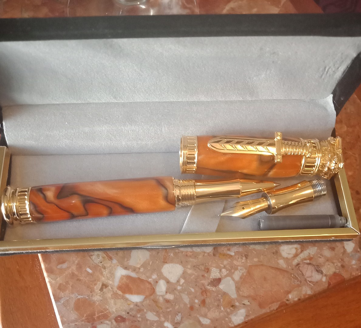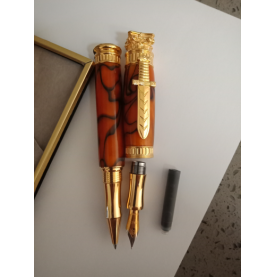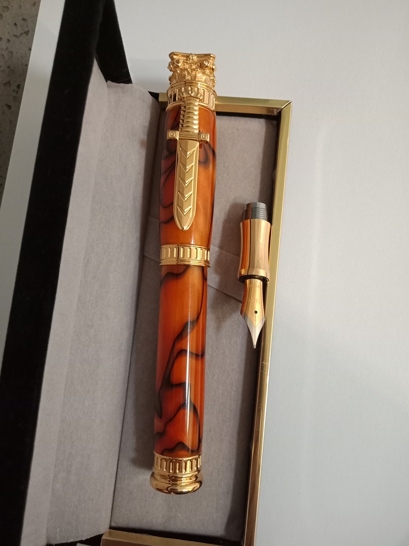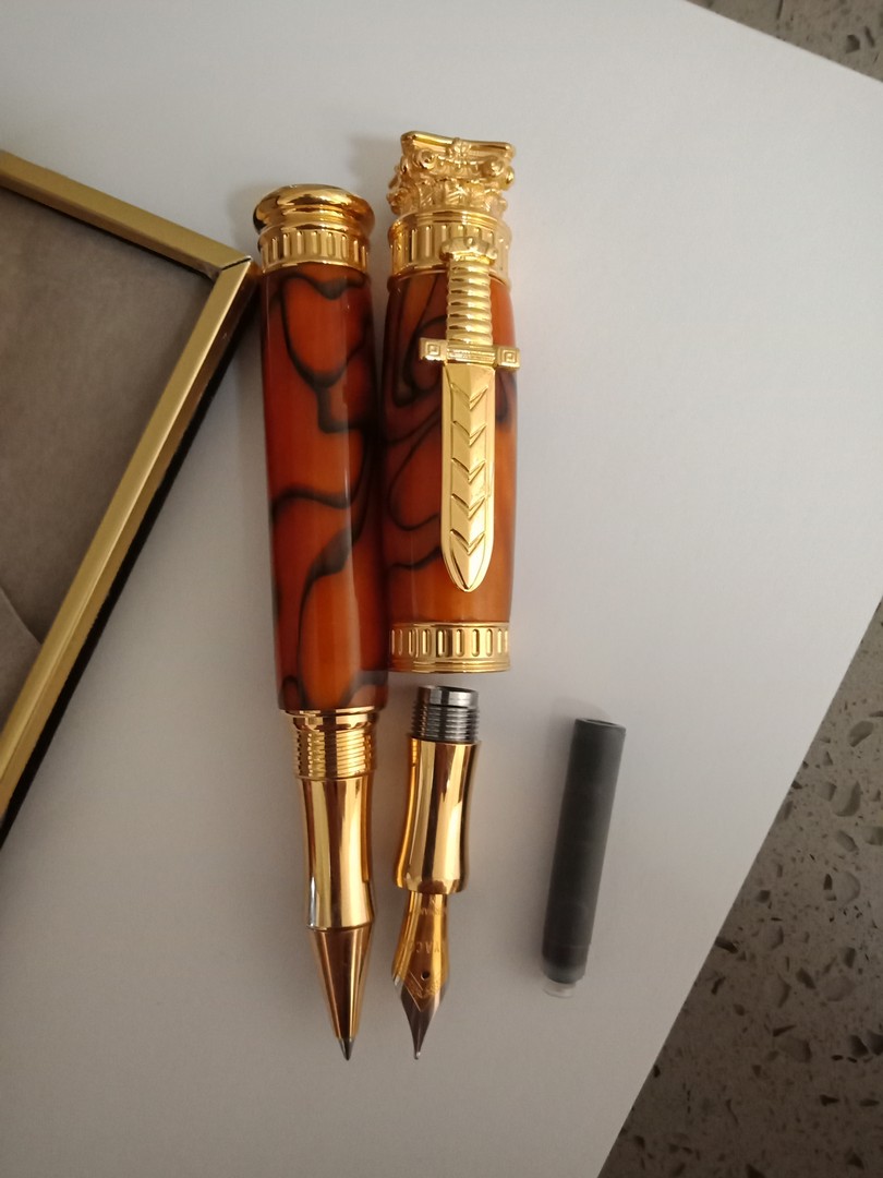 Not for the faint harted. This is both a fountain pen and normal ball point pen with hugh ink reserve. Big beautiful tiger color and pattern resin with gladius sword and roman pillar all in 22kt gold plate . Will never tarnish. If you have a million dollar contract to sign this is the pen to do it with. Supplied in white silk and faux leathe case.