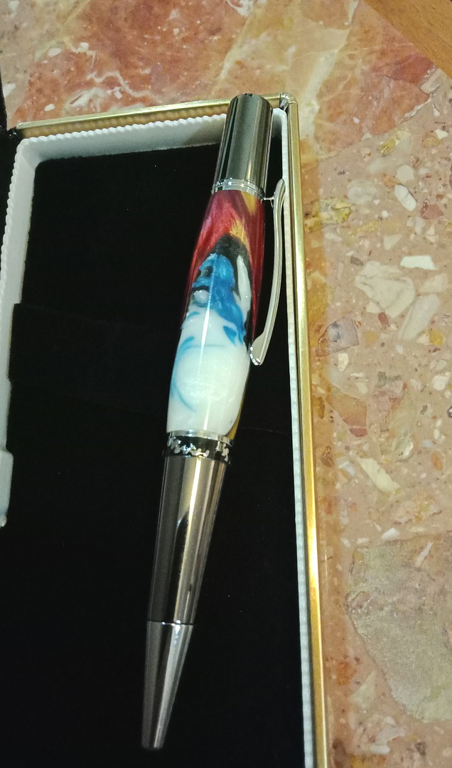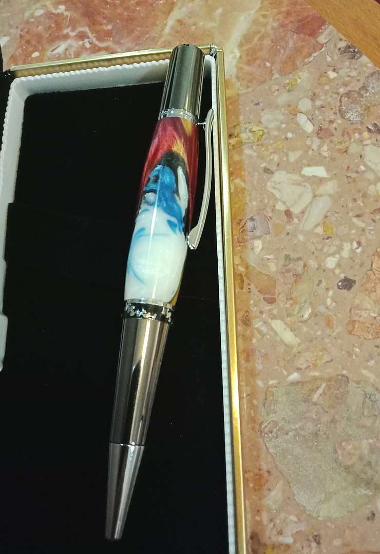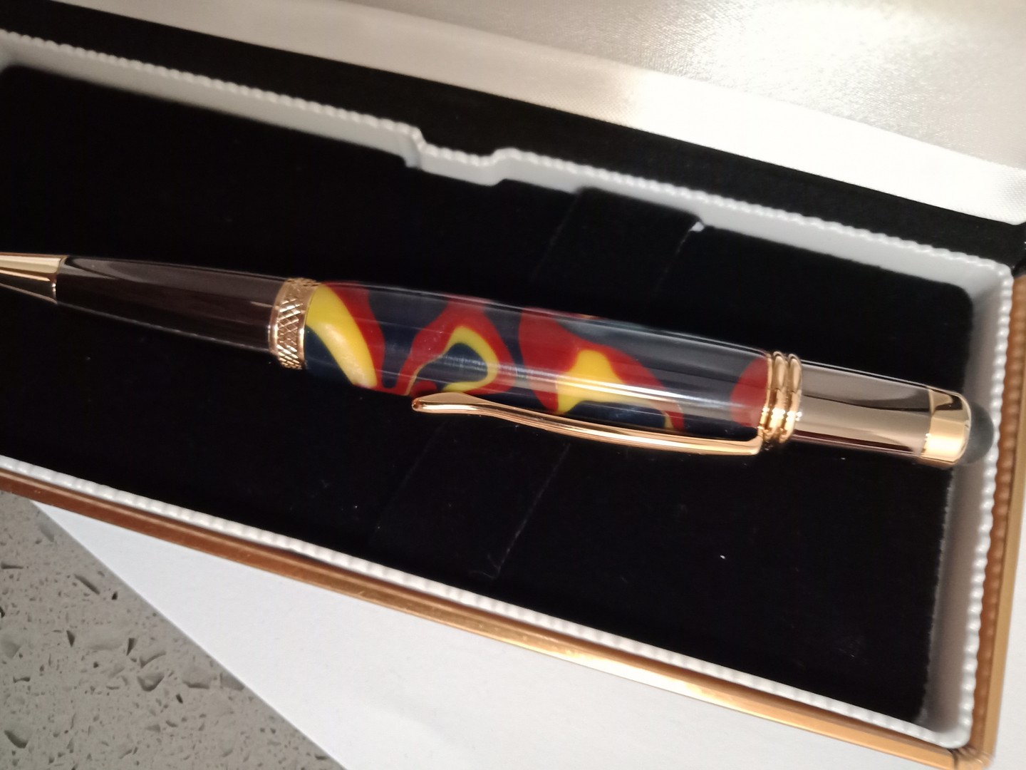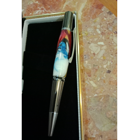 This Australian pen has southern cross on stylus and aboriginal motif on center band( look at gallery below ) chrome and gunmetal . Body was a bought in as a special blank and turned down by myself. Blue / white / blood red translucent . Interference pigments were used. This is simply a top pen with an Australian theme . Supplied in a black faux leather case