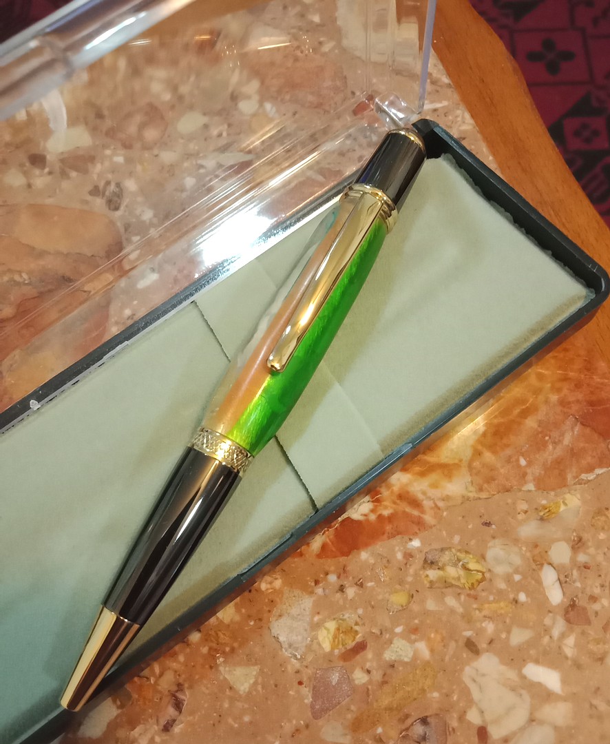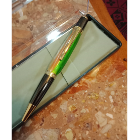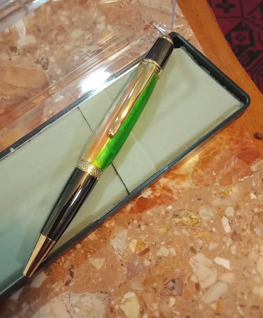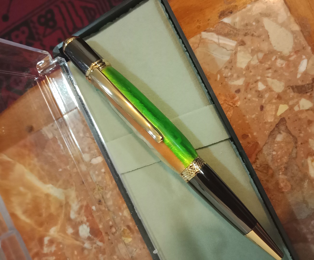 Bloody big pen, I made this pen with Gold Green resin combo. A 2 part pen finish in 22kt gold plating. This is a stand out pen in the Australian office. Hugh ink supply will last for years.