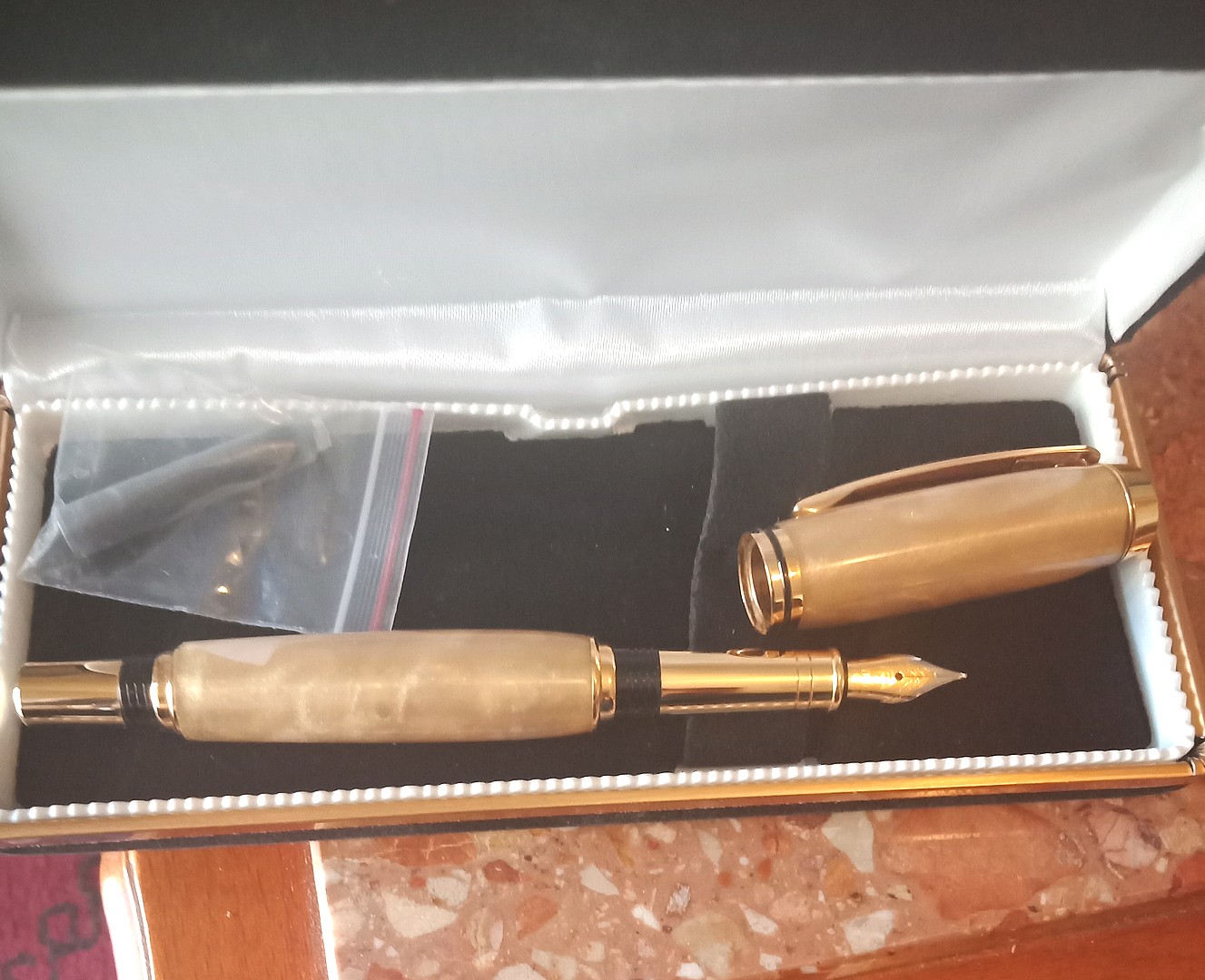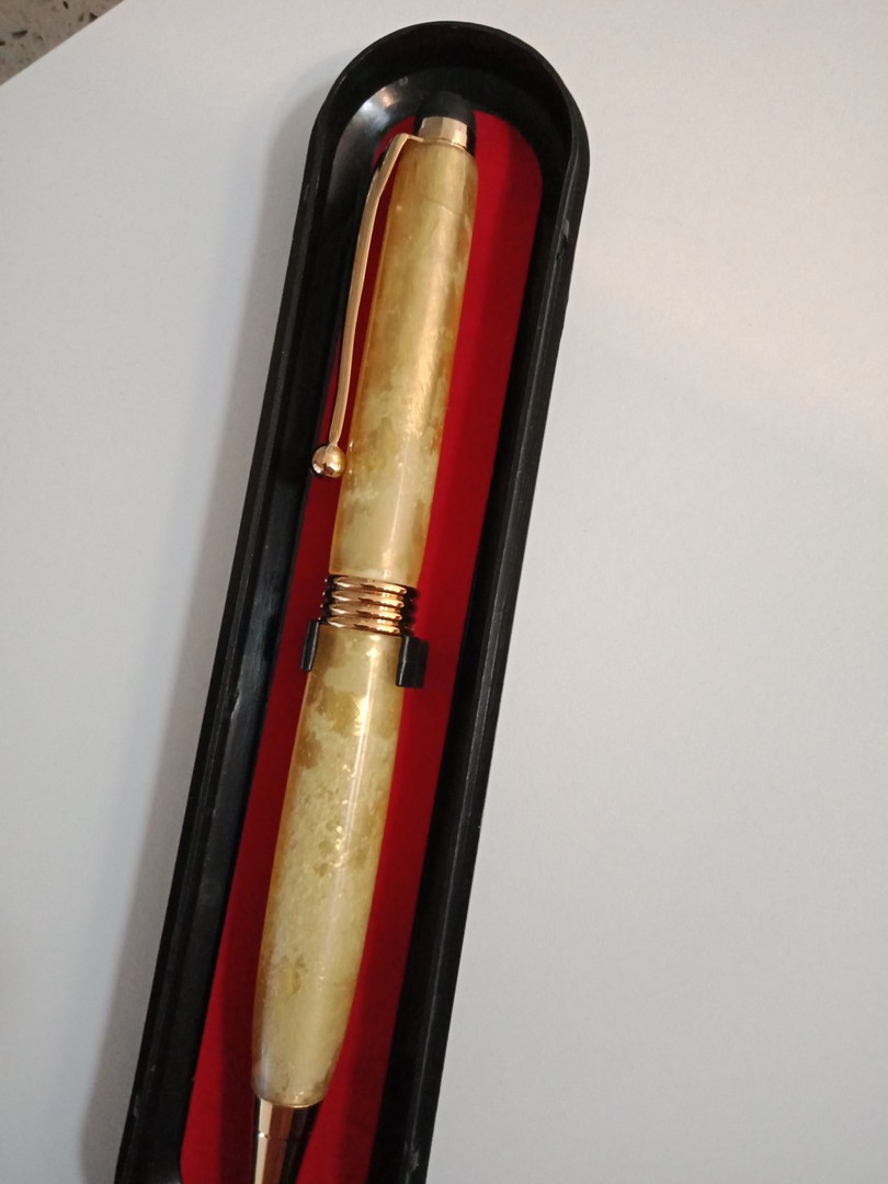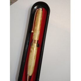 Pearlescent gold yellow body resin. Colour and casting hand made , metal parts 22kt gold plating. ( will never tarnish ) nib "M". Supplied with pen pump converter ( not shown )+ fountain pen cartridge in white silk / black velvet case. Very nice finish. You will not see two of them